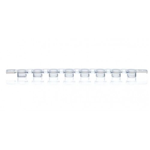 Tira de 8 tampas planas (apropriadas para tempo real) unidas não acopladas aos tubos.