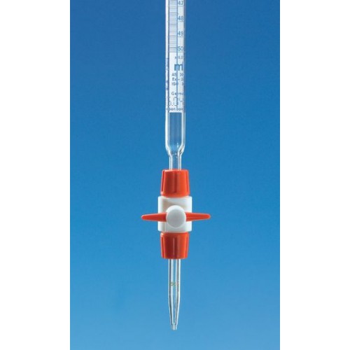 Fabricada em vidro Duran de alta resistência, a bureta compacta BRAND é modular as partes (escala/tubo, torneira de teflon e ponta) podem ser desmontados para melhor limpeza.
