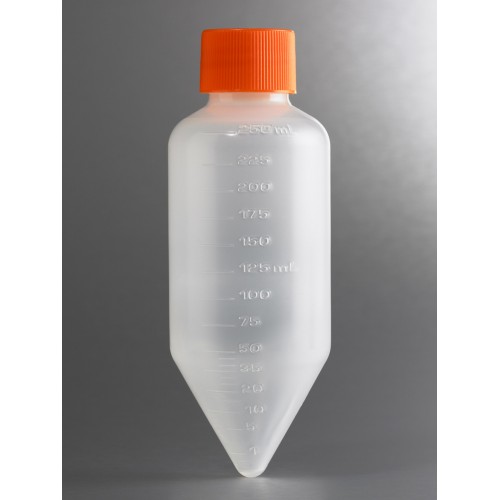 Corning® 250 mL polypropylene (PP) centrifuge tubes are ideal for applications requiring large volume centrifugation. Please check our Technical Information Listing for information on the physical and chemical properties of Corning plastic centrifuge tubes as well as important suggestions for safe use.
