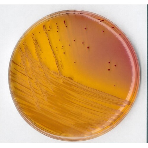 Maltose and lactose are metabolized by most enterococci with the production of acid and thus promote the growth of these bacteria; undesired microorganisms are largely supressed by sodium azide. Acid formation is detected by bromocresol purple which changes its colour to yellow. Enterococci reduce TTC to give a red formazan and thus appear as red colonies.