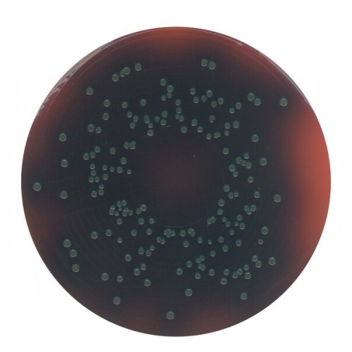 PALCAM Agar provides a quantitative cultivation of Listeria monocytogenes, while, at the same time, inhibiting the Gramnegative and most of the Gram-positive accompanying bacteria. The selectivity of the medium results form its content of polymyxin, acriflavin, ceftazidime and lithium chloride. L.monocytogenes breaks down the esculin in the medium to glucose and esculetin. Esculetin forms an olive-green to black complex with iron(III) ions which stains the colonies of L.monocytogenes. Mannitol-positive accompanying bacteria such as staphylococci grow as yellow colonies, if they are not inhibited.